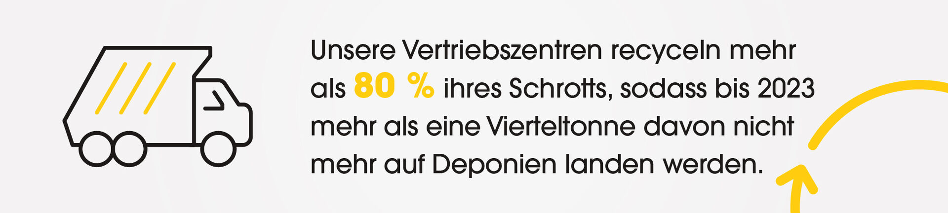Unsere ersten Bemühungen konzentrierten sich auf den Bereich, in dem wir die meiste Kontrolle haben – in unseren eigenen vier Wänden. Nach einer umfassenden internen Prüfung unserer Praktiken haben wir Verschwendung identifiziert und eliminiert – vom Pausenraum über das Lager bis hin zum Sitzungssaal. Im Jahr 2024 hat unsere gesamte Organisation große Fortschritte erzielt, um unsere Umweltauswirkungen zu reduzieren. Beispielsweise wurden in unserem Hauptvertriebszentrums über 90 % der Abfälle nicht der Deponie zugeführt. Im Vertriebszentrum liegt ein weiterer Schwerpunkt auf allgemeiner Abfallreduzierung. Zwischen 2023 und 2024 konnte hierdurch die Gesamtmenge an Deponieabfällen um 54 % reduziert werden.
