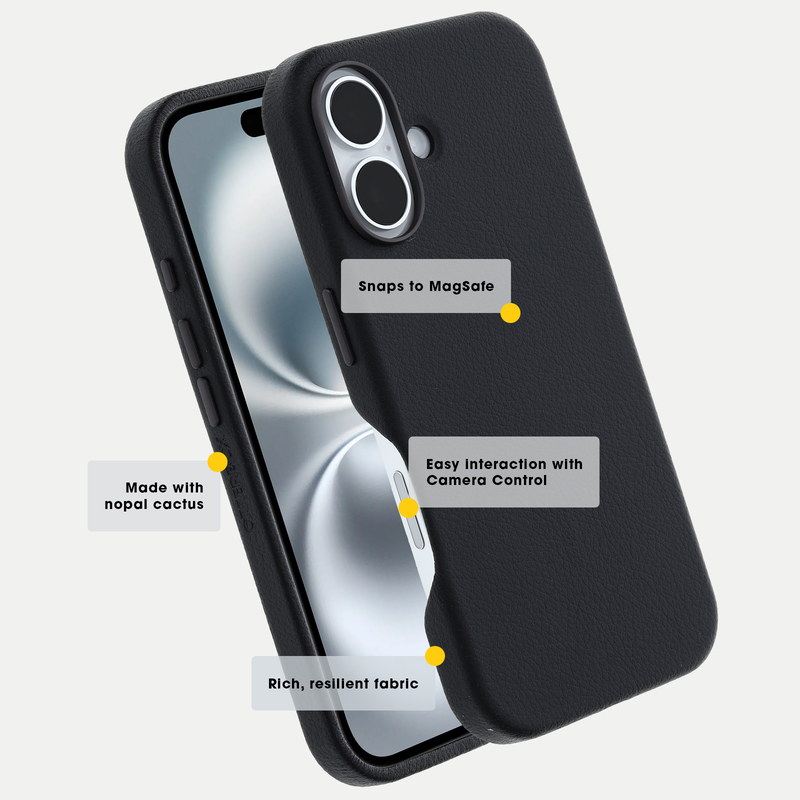 Experience Symmetry Series Cactus Leather for MagSafe. Meet the desert’s rarest bloom – cactus-based leather substitute by Desserto®. It’s a plant-based alternative to animal leather that comes from nopal cactus that’s organically grown and sustainably harvested without the need for irrigation. It doesn’t just look good, it’s also resilient to scratches and stains. Every aspect of this case is elevated, from the metal buttons and inner felt backing to the meal camera crown and razor-thin profile. And rounding out the refined design of your cactus-based leather case are powerful MagSafe magnets and proven drop protection.
