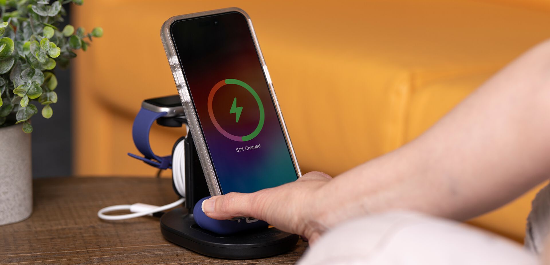 Yes, you can always lay your phone flat on a charging pad while you work, but then you’re always craning your head or lifting it up when an alert rolls in. MagSafe is strong enough to defy gravity when you connect your phone on a 3-in-1 Charging Station. Small enough to sit anywhere, stable enough to withstand even an iPhone 13 Pro Max, it holds your device at just the right angle to watch the screen as it powers. There’s even a charging pad for your Apple Watch and Apple AirPods, delivering juice three ways with one cord.